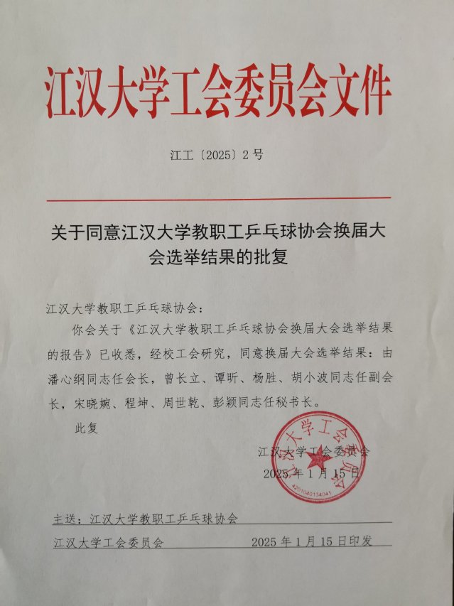 关于同意江汉大学乒乓球协会改选会长副会长秘书长选举结果的批复
